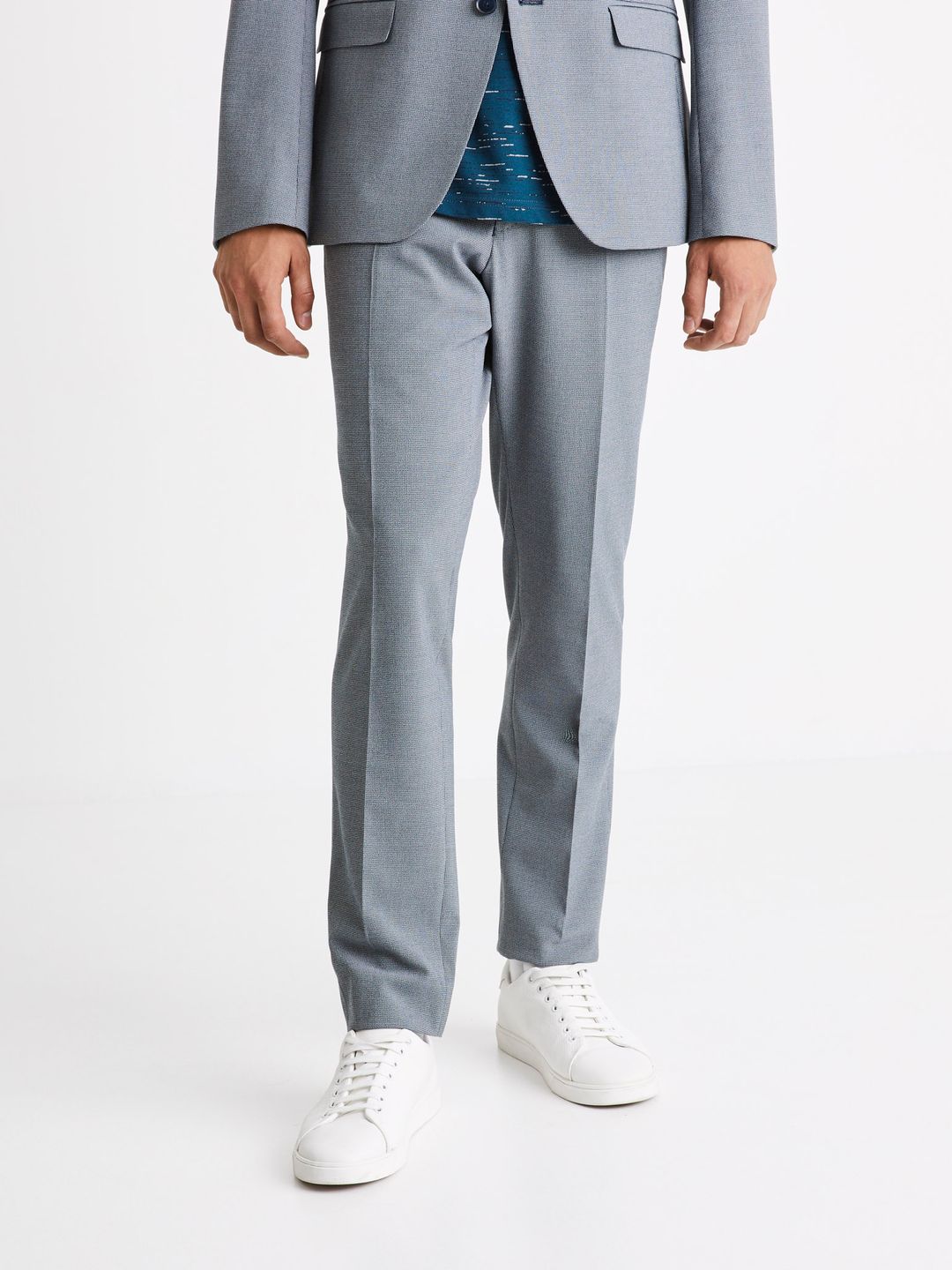 Svetlomodré spoločenské nohavice klasického strihu. Slim nohavice. Skryté zapínanie, pevný pás a pútka na opasok. Predné šikmé vrecká a zadné zapustené vrecká so zapínaním na gombík. Príjemný a pružný materiál.