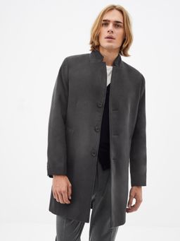 Kabát so stojacím golierom a zapínaním na gombíky. Ľahko vypasovaný strih. Predné šikmé vrecká. Rázporok.