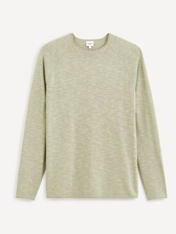 Jednofarebný sveter. Okrúhly výstrih a raglánové dlhé rukávy. Príjemný materiál.