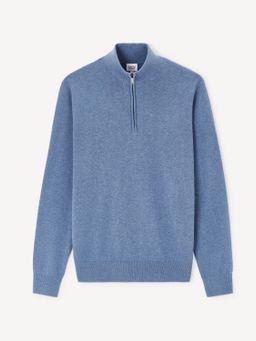 Pletený sveter s vysokým stojačikom. So zapínaním na zips. Dlhé rukávy a pružné rebrované lemy. Bavlnený a jednofarebný.