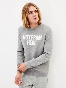 Pánsky sveter vo svetlo šedej farbe. Nápis Not from here. Jemný hladký melír. Sveter má okruhlý výstrih a pružné náplety. Príjemný materiál. Sveter skvele doplní džínsy a koženú bundi.
