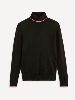 Sveter s rolákom a s prímesou vlny. Mäkká a hrejivá pletenina s farebným lemom roláka a rukávov. Hodí sa k džínsom aj nohaviciam.
