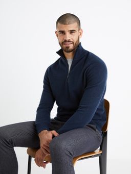 Vlnený sveter so stojačikom na zips. Dlhé rukávy a pružné rebrované lemy. Jednofarebný.