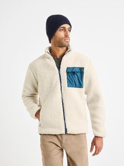 Bunda z imitáciou baránka. So zapínaním na zips. Na hrudi vrecko s chlopňou v kontrastnej farbe. Predné šikmé vrecká na zips. Smotanová farba s modrým olemovaním.