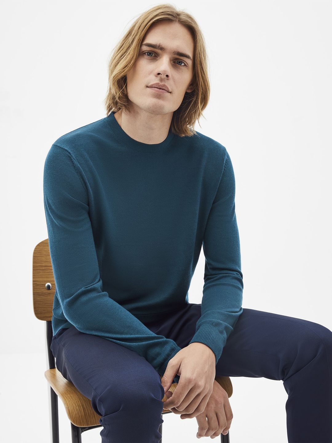 Sveter s hladkou štruktúrou. Veľmi jemná merino vlna. Okrúhly výstrih ku krku. Pružné náplety.
