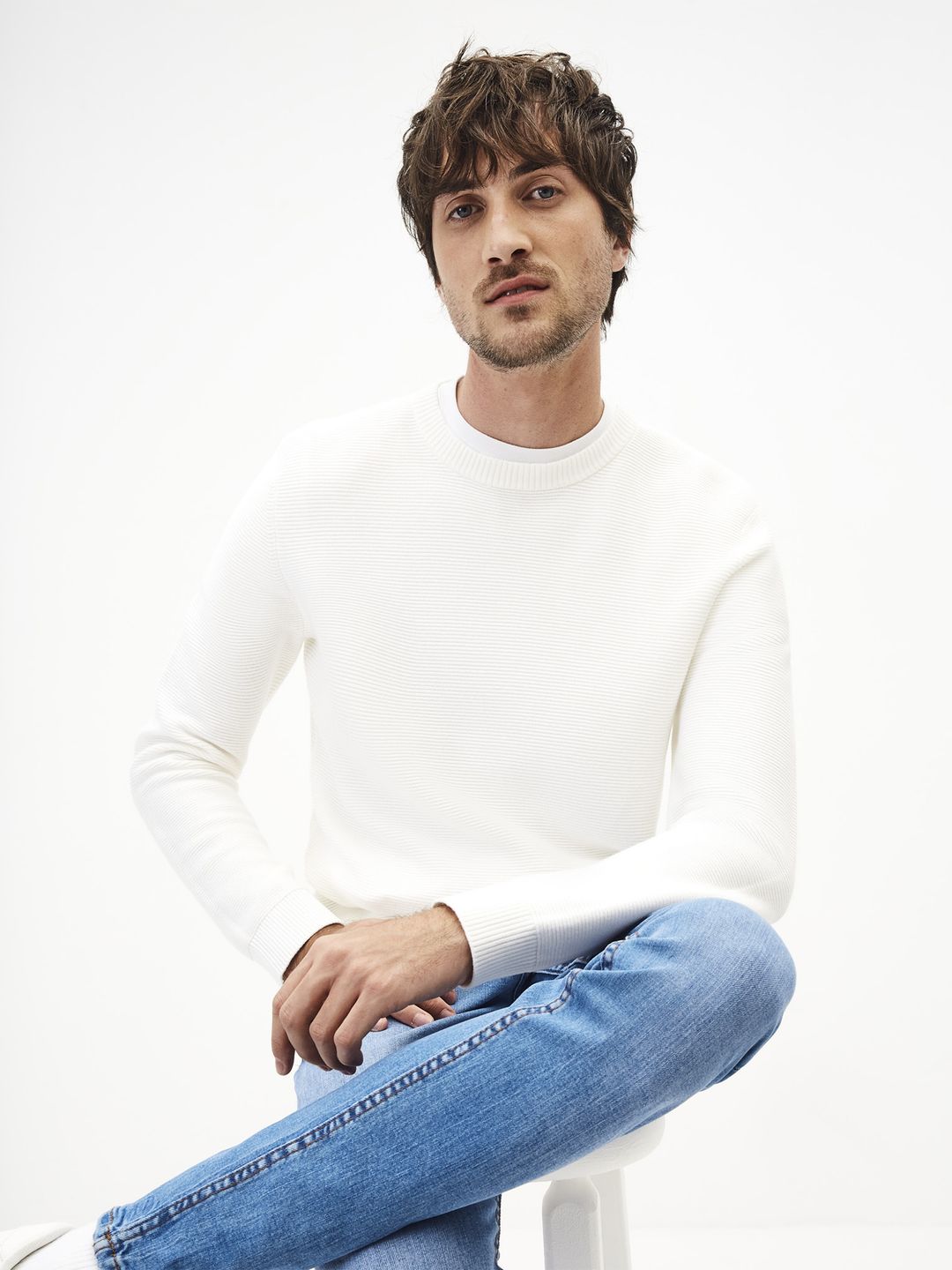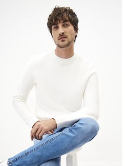 Hladko pletený bavlnený sveter v bielej farbe. Okrúhly výstrih ku krku. Pružné náplety.