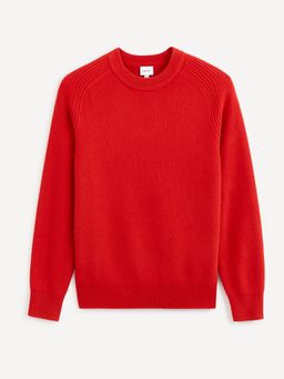 Pletený sveter s okrúhlym výstrihom. Výrazná červená farba. Príjemný materiál.