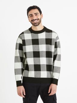 Pletený sveter s výrazným kockovaným vzorom. Okrúhly výstrih ku krku. Príjemný materiál.