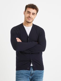 Tmavo modrý vlnený kardigan sa zapínanie na gombíky. Merino vlna je veľmi jemná k pokožke. Výstrih do V a pružné lemy.