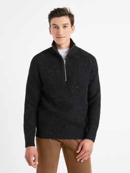 Pletený sveter so stojačikom na zips. Čierna farba s nopkami v kontrastnej farbe.