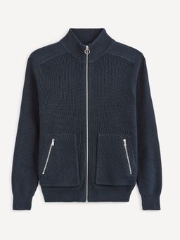 Tmavo modrý kardigan so zapínaním na zips. Šikmé bočné vrecká aj na zips. 100% bavlna.