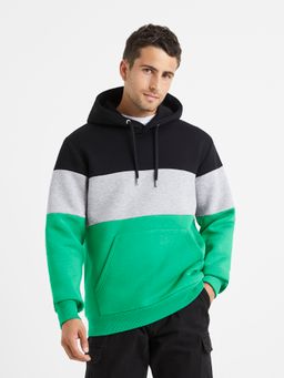 Mikina cez hlavu. Kapucňa so sťahovacou šnúrkou. Široké farebné pruhy. Priestranné klokanie vrecko.