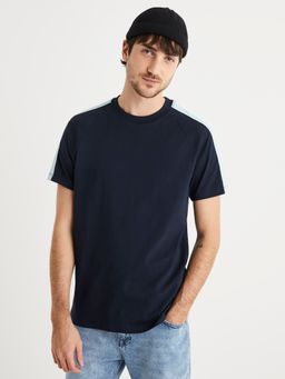 Bavlnené tričko s farebnými pruhmi na ramenách. Krátky rukáv a okrúhly výstrih ku krku.