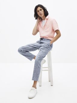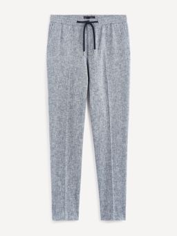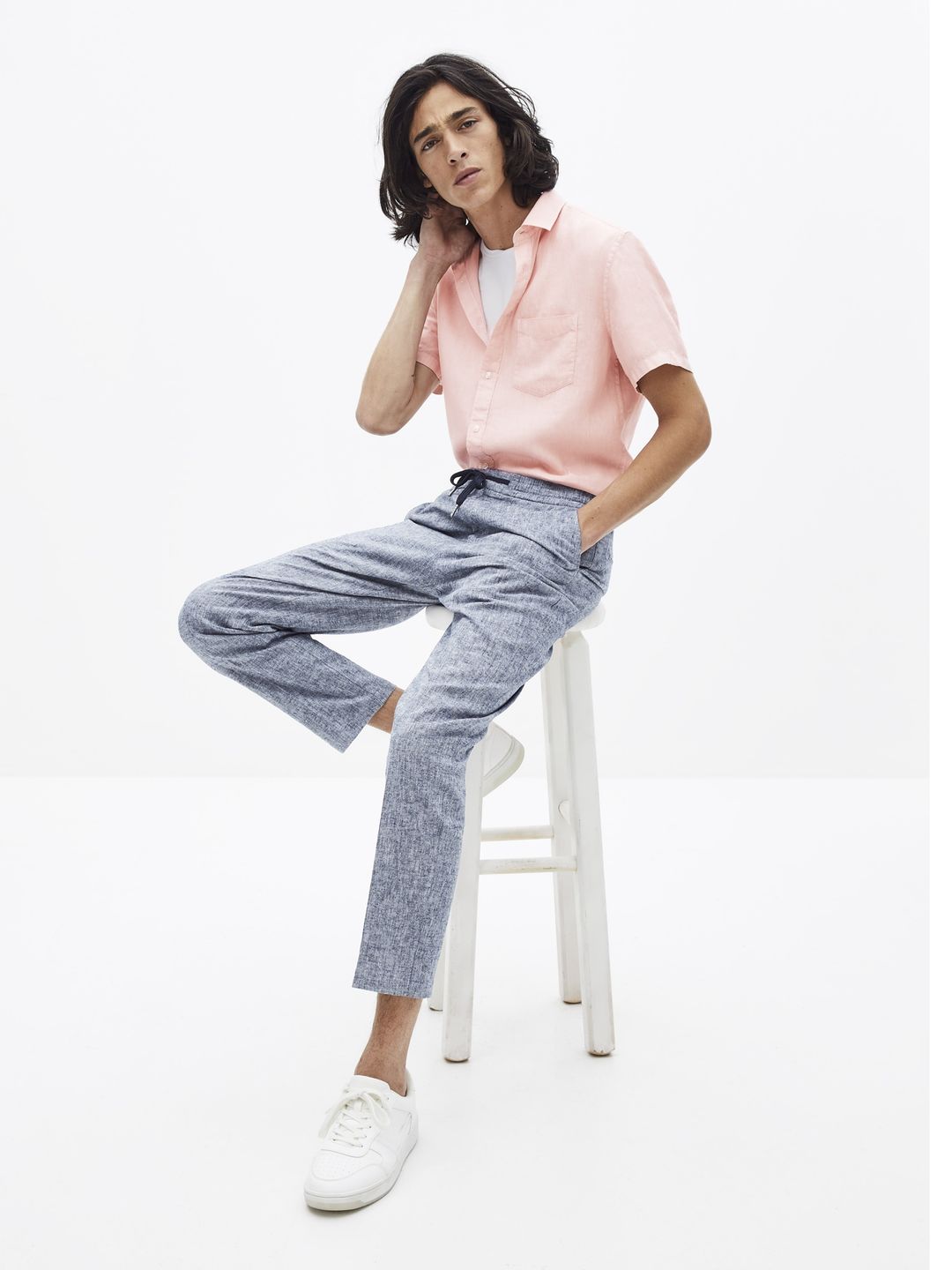 Naťahovacie nohavice s pružným pásom. V páse regulačné šnúrka. Šikmé bočné vrecká. Zadné vrecká. Zmes bavlny a ľanu.
