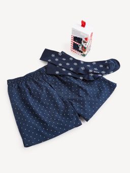 Trenírky a ponožky v darčekovom balení. S drobným vzorom snehových vločiek a v modrej farbe. Papierová krabička s vianočným motívom a pútkom.