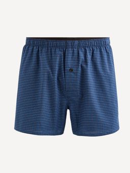Bavlnené trenírky s pružným pásom. Rázporok so zapínaním na gombík. Vzdušný a voľný strih. Drobný kockovaný vzor.