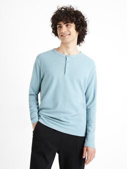 Príjemné tričko s dlhým rukávom. Okrúhly výstrih so zapínaním na tri gombíky. Rovný strih. Hodí sa k džínsom a teniskám.