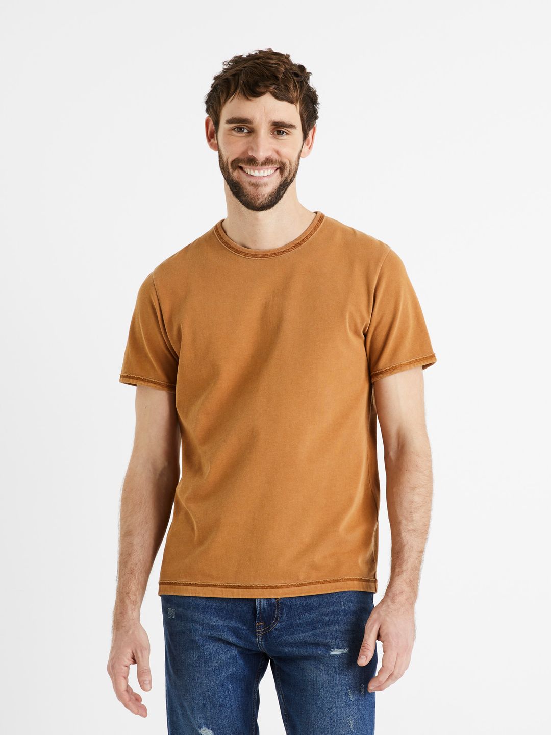 Jednofarebné tričko s krátkym rukávom. Okrúhly výstrih a rovný strih. Ozdobne prešité lemovanie.