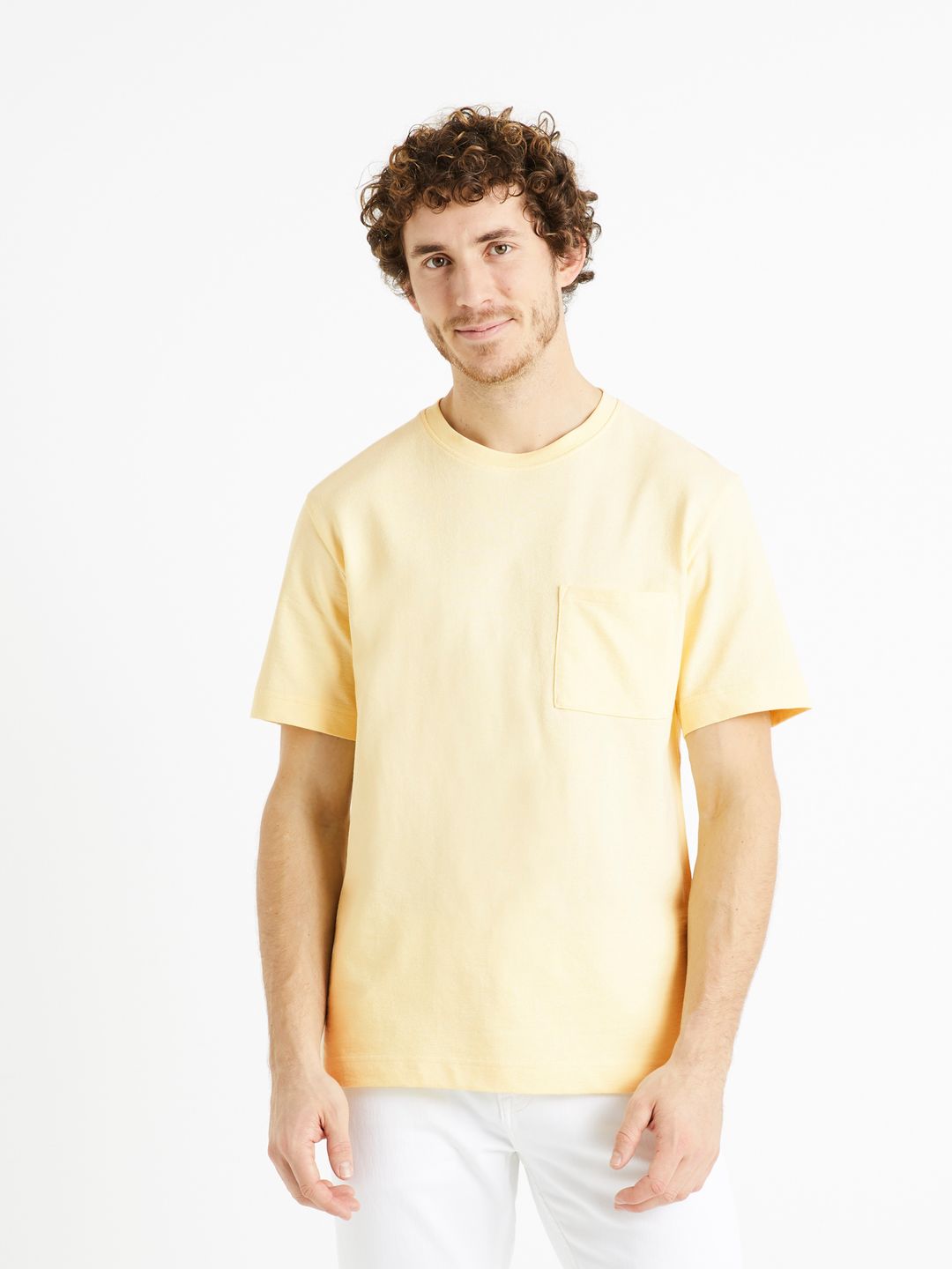 Jednofarebné bavlnené tričko s krátkym rukávom. Okrúhly výstrih ku krku. Na hrudi našité malé vrecko. Rovný strih.