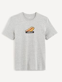 Tričko s krátkym rukávom. Svetlosivý melír. Potlač na prednej strane. Okrúhly výstrih ku krku. Príjemný materiál.