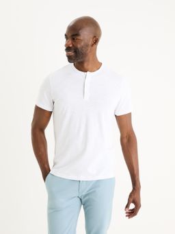 Bavlnené tričko s okrúhlym výstrihom a zapínaním na gombíky. Tričko má krátky rukáv a rovný strih. Bavlnené, hladké a jednofarebné.