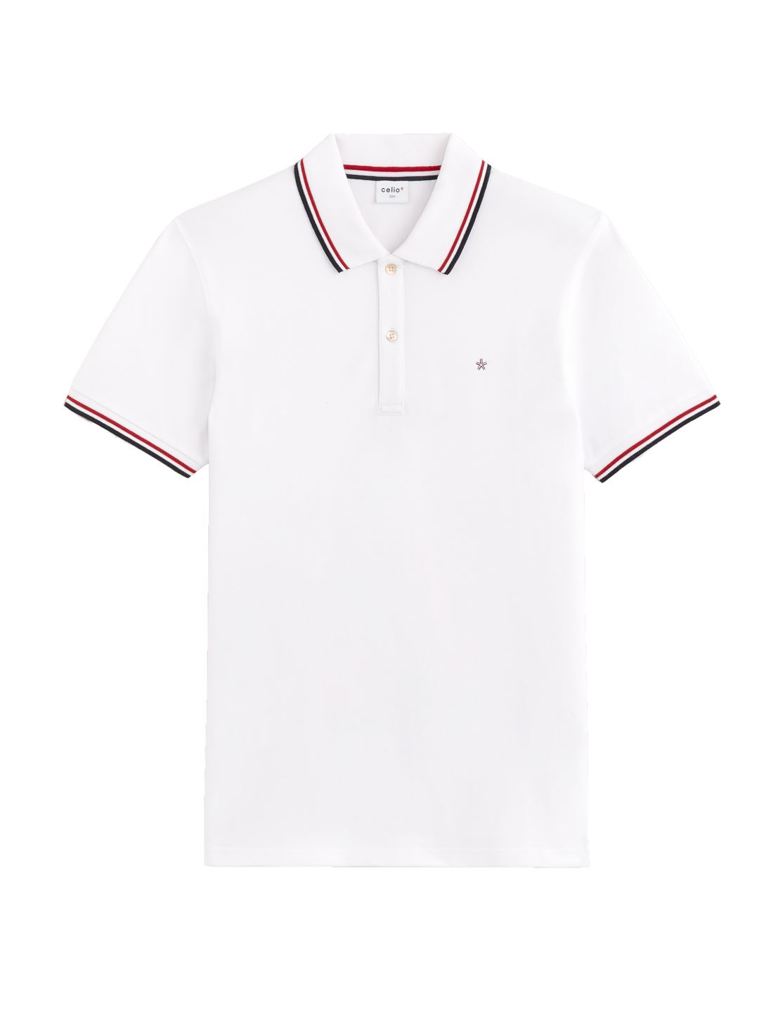 Polo tričko s farebne olemovanými rukávmi a golierom. Krátky rukáv a rovný strih.
