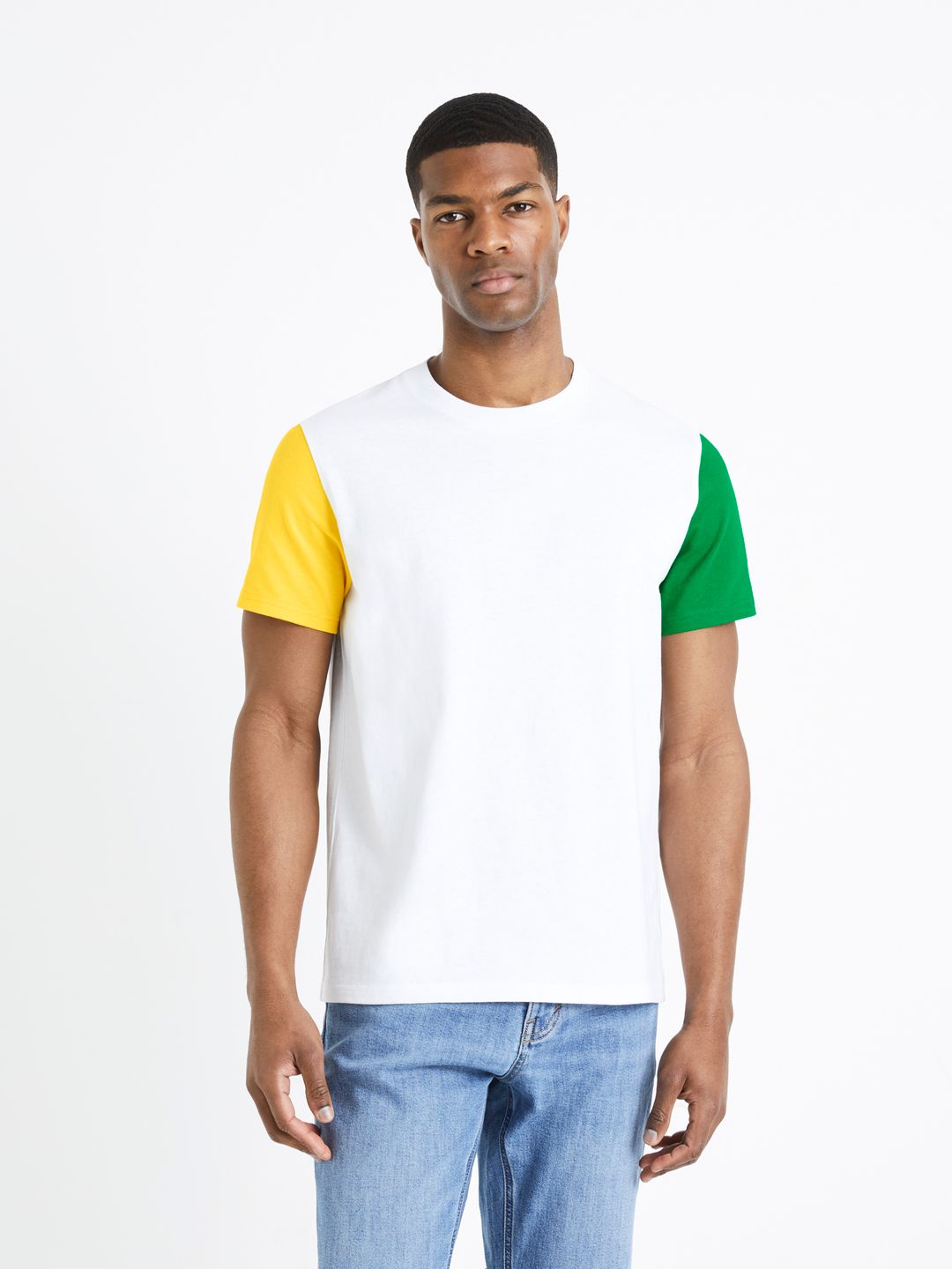 Biele bavlnené tričko s krátkym rukávom. Jeden rukáv v zelenej farbe a druhý v žltej. Okrúhly výstrih ku krku a rovný strih.