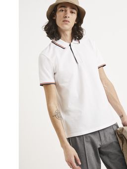 Bavlnené polo tričko s farebným olemovaním rukávov a goliera. Krátky rukáv a rovný strih. Drobná reliéfna štruktúra piké. S obsahom elastanu.