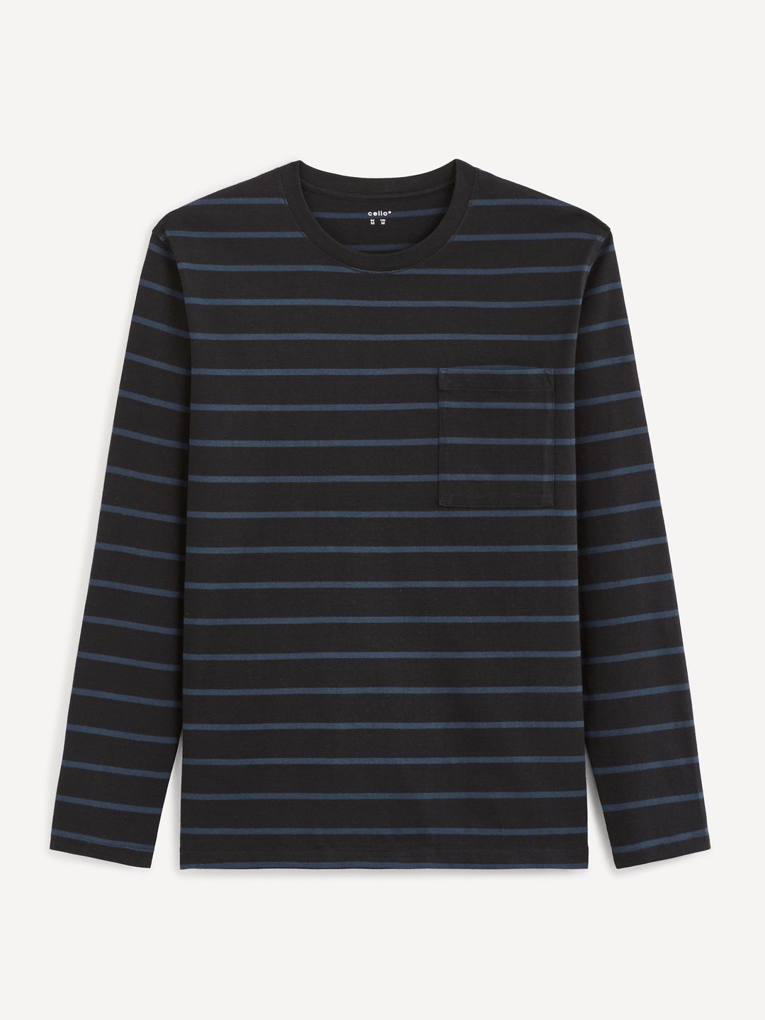 Pruhované tričko s dlhým rukávom. Vaflová štruktúra. Okrúhly výstrih ku krku. Na hrudi kapsička. 100% bavlna.