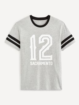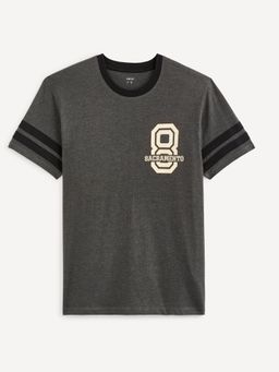 Tričko baseball. Krátky rukáv a okrúhly výstrih. Na rukávoch čierne dva pruhy. Na hrudi nápis a číslovka 8. Príjemný materiál.
